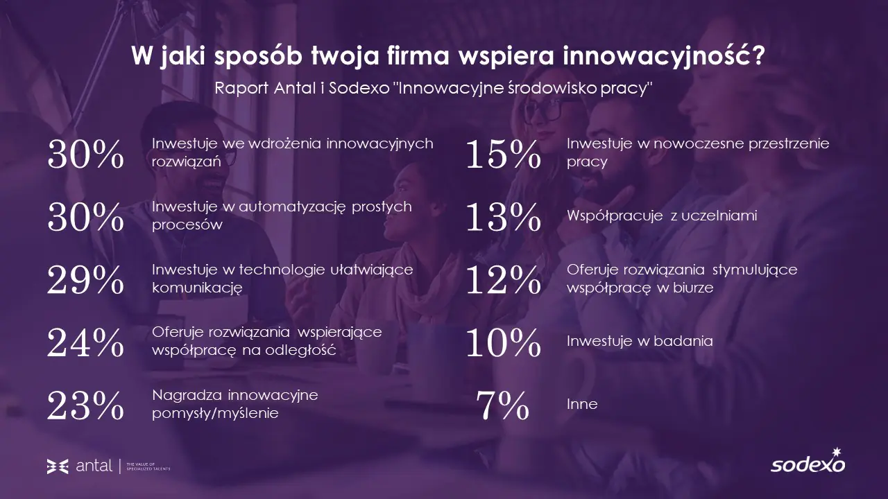 Innowacyjne działania mają doprowadzić do poprawy konkurencyjności konkretnych przedsiębiorstw, co może mieć wpływ na rozwój gospodarczy regionów czy nawet państw. Są wykorzystywane w każdej dziedzinie gospodarki. Ich poszukiwanie i stosowanie jest z jednej strony bardzo ryzykowne i nieprzewidywalne, jednak z drugiej jest też szansą dla przedsiębiorstwa na utrzymanie a nawet wzmocnienie pozycji rynkowej. Antal oraz Sodexo Polska przygotowali raport “Innowacyjne środowisko pracy”, które zostało przeprowadzone metodą CAWI na próbie 1 016 specjalistów i menedżerów w terminie 8-18 września 2022 roku. Patronami raportu są Pracodawcy RP oraz SPCC.