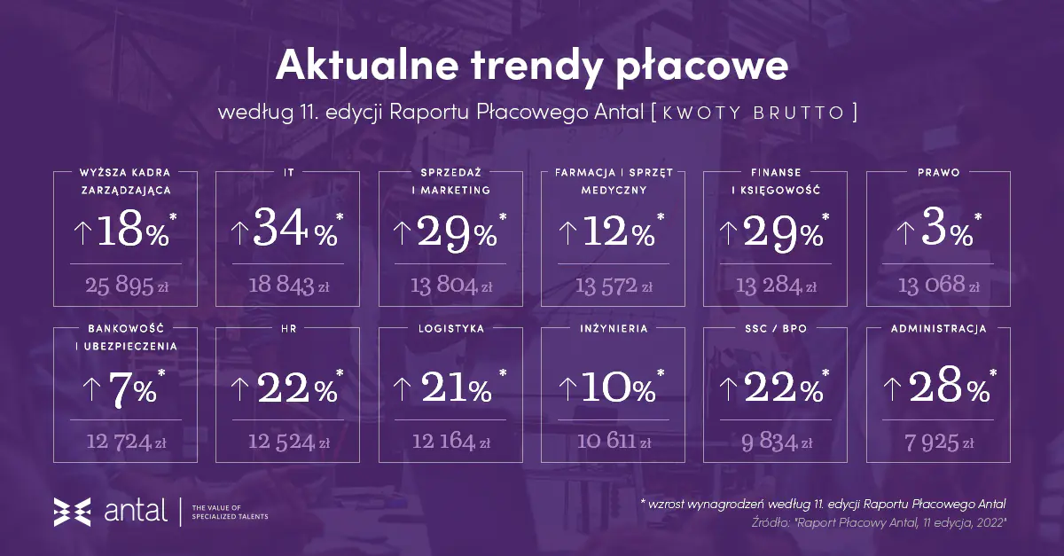 Specjaliści i menedżerowie zarządzania zasobami ludzkimi zanotowali wzrost wynagrodzeń o 22% – średnio wyniosło ono 12 524 zł brutto. Średnie miesięczne wynagrodzenie brutto wyniosło tu 13 284 zł. Dynamika wzrostu wynagrodzeń w centrach usług wspólnych także rośnie (22%) - dzięki średniemu miesięcznemu wynagrodzeniu w wysokości 9 834 zł brutto. W logistyce średnio został odnotowany wzrost o 21% i miesięczna pensja brutto wyniosła 12 164 zł. W branży farmaceutycznej i sprzętu medycznego średnie miesięczne wynagrodzenie wyniosło w badanym okresie 13 572 zł brutto (wzrost o 12%). Na stanowiskach inżynieryjnych odnotowano wzrost o 10% – średnie miesięczne wynagrodzenie wyniosło 10 611 zł brutto. W bankowości i ubezpieczeniach wyniosło ono 12 724 zł brutto (wzrost o 7%). Prawnicy, którzy zyskali najwięcej w początkach pandemii, obecnie odnotowali wzrost przeciętnych płac o jedynie 3% Ich średnie miesięczne wynagrodzenie wyniosło 13 068 zł brutto. Płace przedstawicieli administracji wzrosły o 28% w stosunku do poprzedniej edycji raportu Antal – ich przeciętnie oferowane wynagrodzenie wyniosło 7 925 zł netto. Mimo znacznego wzrostu jest to wciąż najniżej opłacana grupa z wymienionych badaniu. Na tle ostatnich lat dynamika wzrostu wynagrodzeń jednak rośnie.