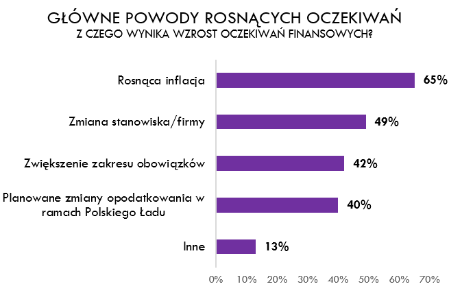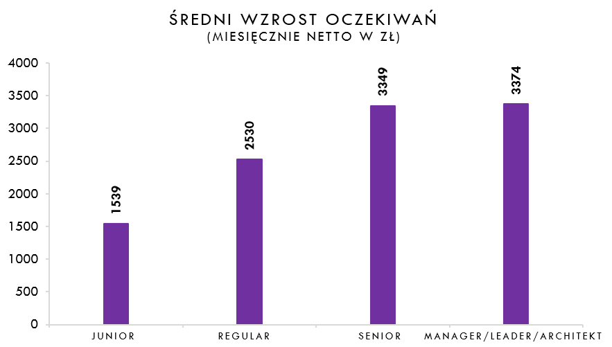 Rosnące oczekiwania wynikają z kilku równocześnie występujących czynników – jednak najsilniejszym z nich jest rosnąca inflacja, którą wskazuje ponad połowa respondentów. 69% badanych specjalistów IT już rozmawiało o swoich rosnących oczekiwaniach z pracodawcą. Tylko w 10% wniosek o podwyżkę został odrzucony, w 15% przyjęty, ale odroczony w czasie. Natomiast większa część respondentów otrzymała już podwyżki. Wśród osób, które otrzymały wzrost wynagrodzenia, aż 29% otrzymało ją w kwocie większej niż 4000 zł netto.