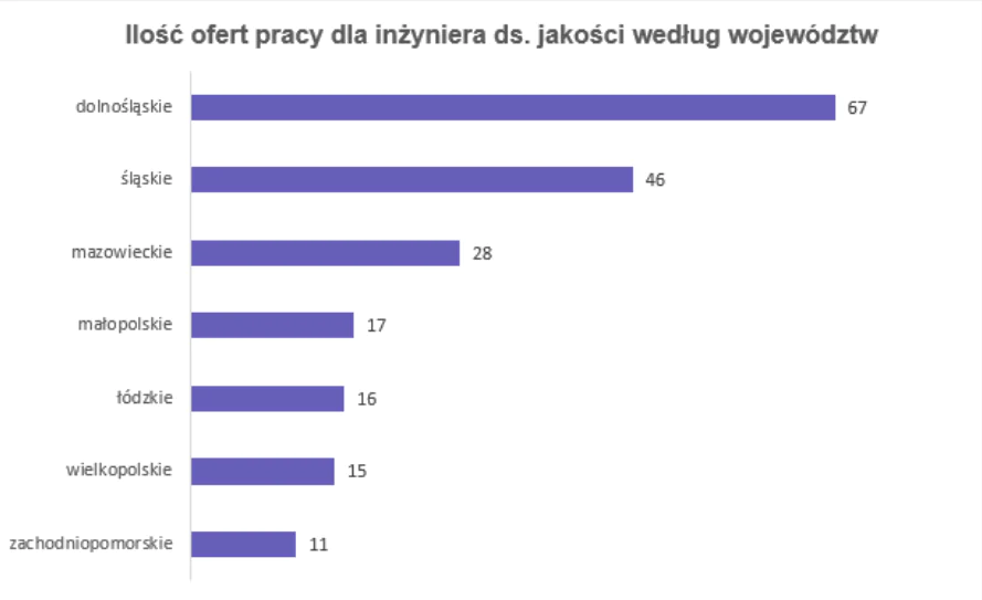 Inżynierów jakości możemy znaleźć w firmach produkcyjnych we wszystkich branżach. Jakość przenika do wielu działów np. do działu zakupów, gdzie sprawdzany jest rodzaj dostawców oraz pozyskiwanych materiałów. W obecnych czasach, gatunek produktu bądź usługi pełni bardzo dużą role przy ich wyborze, dlatego firmy dbają o to, aby była ona na najwyższym poziomie. Aby uzyskać i utrzymać wysoki stan, potrzebni są wykwalifikowani specjaliści, którzy będą dbać o ten obszar. Ze względu na sytuację związaną z pandemią, rynek pracy uległ zmianie. Część pracowników zmieniła w tym czasie pracodawcę, inna, niestety padła ofiarą redukcji zatrudnienia. Obecnie rynek podnosi się z kolan i otwierane są kolejne rekrutacje zwłaszcza w obszarze jakości. Najwięcej ofert związanych z jakością, możemy zaobserwować w województwie dolnośląskim, gdzie znajduje się bardzo dużo firm zajmujących się produkcją.