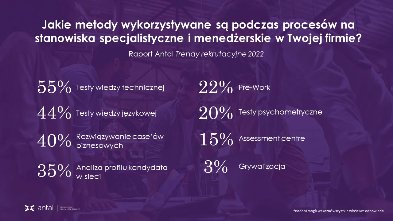 Proces rekrutacyjny składa się nie tylko z rozmowy między pracodawcą a kandydatem poszukującym zatrudnienia. Często jest on wspomagany wykorzystaniem dodatkowych narzędzi. Kandydaci ubiegający się o pracę w sektorze IT a także bankowości, ubezpieczeniach i instytucjach finansowych mogą spotkać się w trakcie rekrutacji z wymogiem przeprowadzenia testów wiedzy technicznej. Osoby znające języki obce, szukające zatrudnienia w firmach z sektora SSC/BPO, poddawane są testom weryfikującym poziom znajomości danego języka. Ponadto osoby ubiegające się o pracę w obszarze bankowości, ubezpieczeń i instytucji finansowych oraz chcących pracować w sektorze FMCG często muszą zmierzyć się z rozwiązaniem przykładowego case’u biznesowego. Wyniki powyższych zadań zdecydowanie ułatwiają podjęcie decyzji o zatrudnieniu bądź odrzuceniu danego kandydata - komentuje Ilona Wróbel, Team Manager & ReX Leader, Antal SSC/BPO.