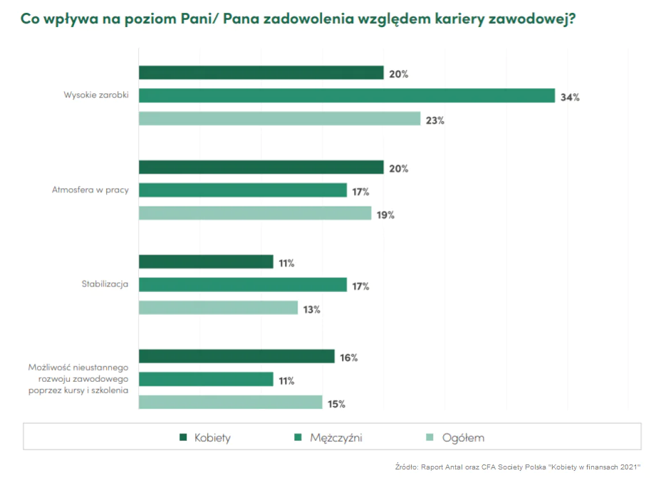 Jeżeli chodzi o zadowolenie płci żeńskiej względem kariery zawodowej, to przede wszystkim wpływają na nie wysokie zarobki (20%) oraz atmosfera w pracy (20%). Dla porównania, dla mężczyzn na satysfakcję z kariery zawodowej w największym stopniu wpływają wysokie zarobki (34%). Jeżeli chodzi o atmosferę w pracy, to dla płci męskiej ma ona o wiele mniejsze znaczenie (17%). Duża różnica między płciami jest również widoczna w aspekcie wagi elastycznych form zatrudnienia (wpływa na zadowolenie 13% kobiet i 4% mężczyzn).