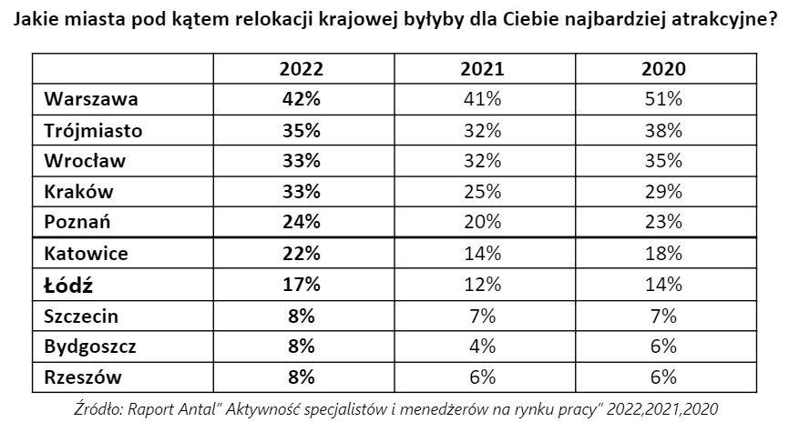 W czołówce miast najbardziej atrakcyjnych pod kątem relokacji, które można określić jako lokalizacje pierwszego wyboru (powyżej 30% wskazań), od lat utrzymuje się: Warszawa, Trójmiasto, Wrocław oraz Kraków. W 2022 najmocniej w rankingu podskoczyło zainteresowanie takimi lokalizacjami jak: Katowice (8 p.p.), Łódź (o 5 p.p.), Poznań (o 4 p.p.) oraz Bydgoszcz (o 4 p.p.). W przypadku zagranicy, zainteresowana relokacją jest 1/3 specjalistów i menedżerów.
