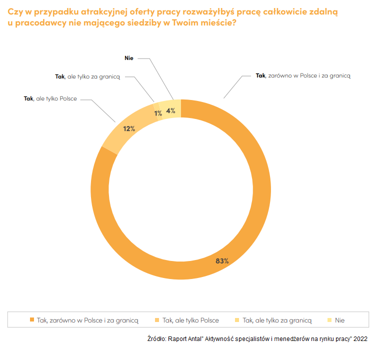 Jako konieczne elementy nowej oferty pracy wymieniane są nie tylko wyższe wynagrodzenie (76%), ale także możliwość pracy zdalnej (53%). Tylko 1/3 badanych wskazuje, że nie potrzebuje pracy zdalnej jako koniecznego elementu do rozważenia oferty pracy. 22% specjalistów i menedżerów musiałoby otrzymać ofertę, w której ma możliwość pracy z domu średnio 2 i 3 dni. Co więcej w przypadku atrakcyjnej oferty pracy aż 83% specjalistów i menedżerów rozważyłoby pracę całkowicie zdalną zarówno w Polsce i zagranicą.