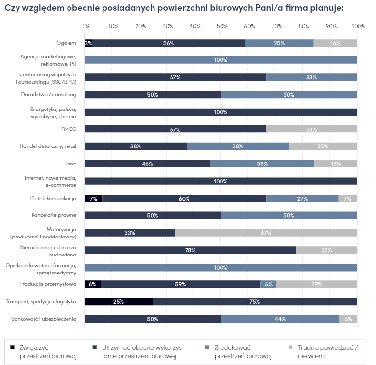 Wbrew obiegowej opinii, większość firm nie planuje zmniejszenia powierzchni biurowej. 56% badanych pracodawców planuje utrzymać obecne wykorzystanie przestrzeni pracy. Niektóre branże planują nawet ich zwiększenie. Analizując wyniki badania, można wyodrębnić trzy grupy, składające się ze zróżnicowanych branż. Pierwsza grupa, to firmy planujące utrzymanie lub zwiększenie obecnie zajmowanej powierzchni biurowej (67% - 100%), do której zaliczamy następujące sektory – SSC/BPO, energetyka, FMGC, IT, nieruchomości, produkcja przemysłowa oraz transport, spedycja i logistyka. Firmy te w zdecydowanej większości nastawiają się na pracę hybrydową, na drugim miejscu przeważa jednak praca zdalna. Natomiast branża energetyczna całkowicie wyklucza pracę zdalną (56% stawia na model hybrydowy, a 44% decyduje się na pracę z biura). W drugiej grupie znajdują się firmy, które zakładają redukcję obecnie zajmowanej przestrzeni biurowej, lub takie, które nie podjęły jeszcze długofalowej decyzji dotyczącej wykorzystania przestrzeni biurowej. Do tej grupy należą branże takie jak motoryzacja i lotnictwo, opieka zdrowotna, handel detaliczny i retail, marketing i inne.