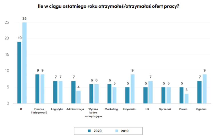 Przeciętnie specjaliści i menedżerowie otrzymują średnio 7 ofert pracy rocznie w porównaniu do 9 ofert w 2019 roku. Firmy zatrudniają ostrożniej, poszukując doświadczonych ekspertów, ale jednocześnie proponując atrakcyjne warunki i ciekawe możliwości rozwoju.