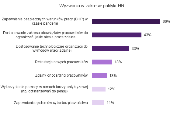 Najwięcej respondentów (60%) wskazują, że wyzwaniem dla ich działalności jest zapewnienie bezpiecznych warunków pracy w czasie pandemii Covid-19. Niemal połowa firm (43%) chce również dostosować zakres obowiązków pracowników do wymogów jakie niesie za sobą praca zdalna. Również dostosowanie technologiczne w tym aspekcie jest ważne dla co trzeciej organizacji.