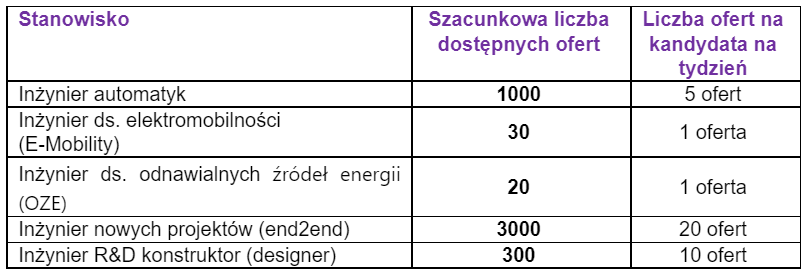 Inżynierowie ds. e-mobility oraz OZE, są poszukiwani głównie przez typowy direct search, stąd ilość oficjalnych ofert na portalach jest jeszcze nie duża. Wykwalifikowanych kandydatów na rynku z tego obszaru również nie ma jeszcze wielu. Kandydat idealny, bowiem to ten, który łączy wiedzę teoretyczną z praktyczną. Temat jest nowy, wymagający doszkolenia kadry. Do rozwoju elektromobilności potrzebne są bowiem nowe kompetencje, które muszą zostać wykreowane, ponieważ e-mobility jest zjawiskiem interdyscyplinarnym, łączącym sektory: motoryzacyjny, informatyczny i energetyczny.