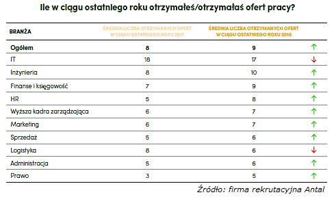 Liczba otrzymywanych zaproszeń do procesów rekrutacyjnych rośnie. Przeciętnie specjaliści i menedżerowie otrzymują rocznie 9 ofert pracy. Analizując średnią liczbę otrzymanych ofert w poszczególnych specjalizacjach, do liderów niezmiennie od kilku edycji należy obszar IT. Wzrost o 25% zanotowany został również w przypadku inżynierów.